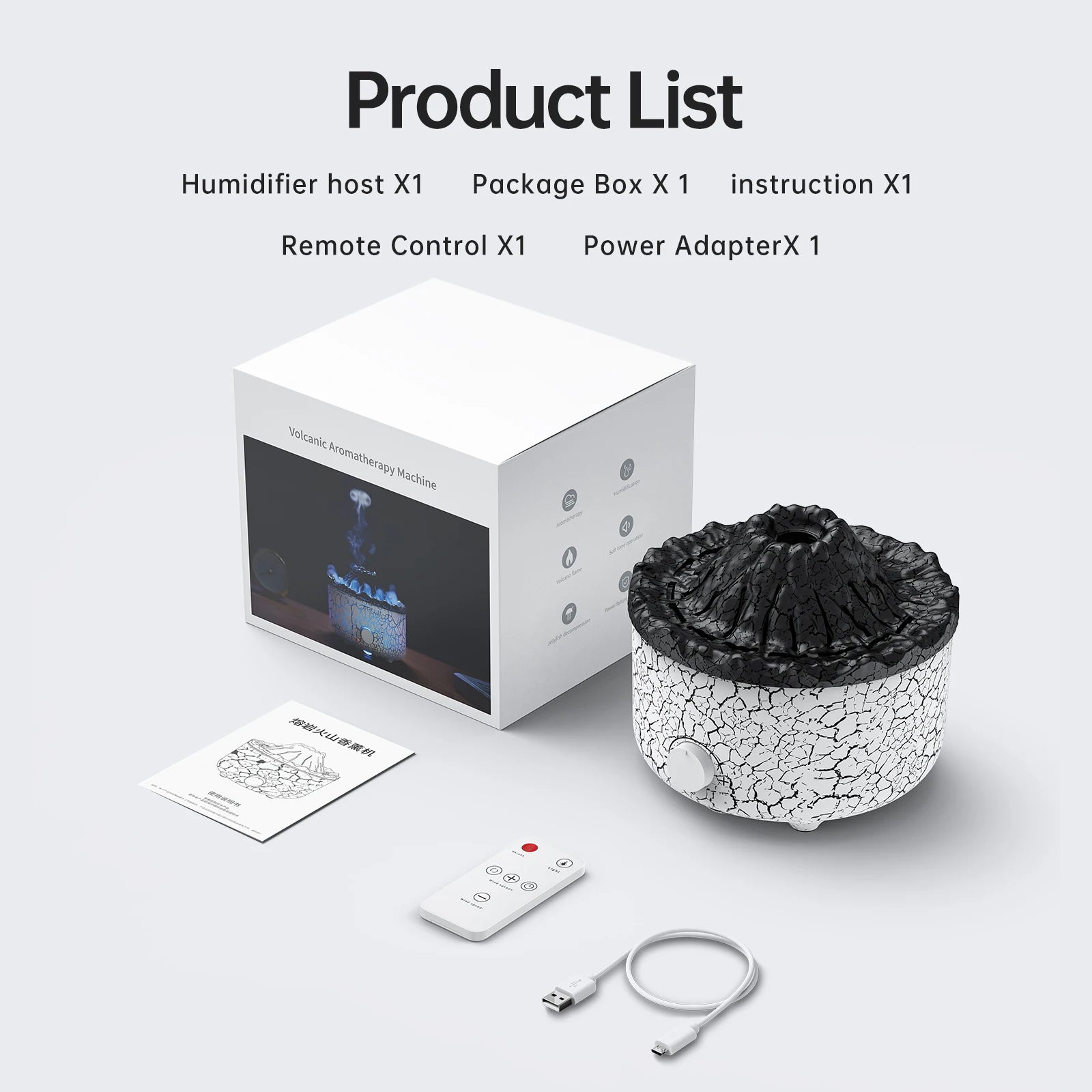 Volcano humidifier*1 Charging cable*1 English instruction manual*1 Remote control*1